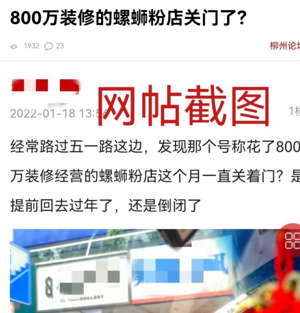 有網(wǎng)友在網(wǎng)上發(fā)帖稱,柳州螺螄粉的“愛馬仕”,號稱花了800萬裝修經(jīng)營的螺螄粉店,近一個月來一直關(guān)著門,是提前回去過年了,還是倒閉了?