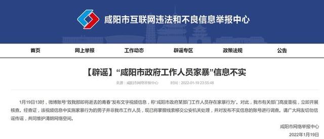 1月19日13時(shí),微博賬號(hào)“致我那即將逝去的青春”發(fā)布文字視頻信息,稱“咸陽市政府某部門工作人員存在家暴行為”。對(duì)此,我市有關(guān)部門高度重視,立即開展核查。經(jīng)查證,該視頻信息中實(shí)施家暴行為的男子并非我市工作人員,現(xiàn)已將掌握線索移交公安機(jī)關(guān)處理,并對(duì)發(fā)布不實(shí)信息的賬號(hào)進(jìn)行調(diào)查。請廣大網(wǎng)友切勿信謠傳謠,共同維護(hù)清朗網(wǎng)絡(luò)空間。