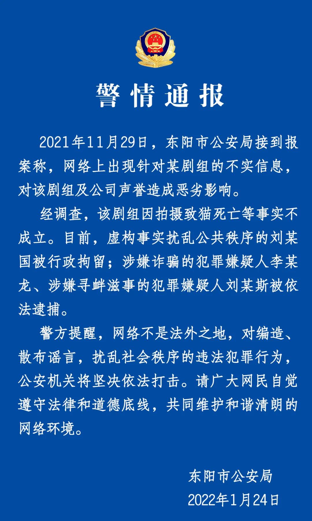 經(jīng)調(diào)查,該劇組因拍攝致貓死亡等事實不成立。目前,虛構事實擾亂公共秩序的劉某國被行政拘留;涉嫌詐騙的犯罪嫌疑人李某龍、涉嫌尋釁滋事的犯罪嫌疑人劉某斯被依法逮捕。
