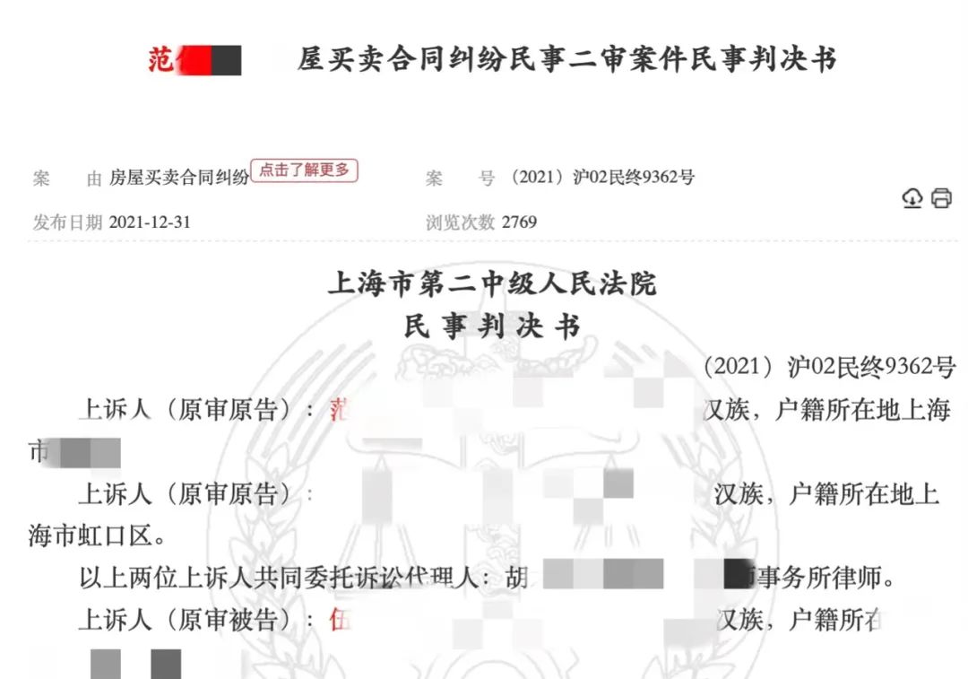 綜上,黃浦法院作出一審判決:確認(rèn)雙方簽訂的《上海市房地產(chǎn)買(mǎi)賣(mài)合同》(含補(bǔ)充條款、附件)、協(xié)議書(shū)均于2020年10月7日解除;伍女士應(yīng)于判決生效之日起10日內(nèi)搬離并歸還房屋,如逾期,則應(yīng)追加支付房屋占有使用費(fèi),按照1000元每天的標(biāo)準(zhǔn)計(jì)算,計(jì)算至實(shí)際歸還之日止;伍女士應(yīng)于判決生效之日起10日內(nèi)一次性?xún)敻哆`約金310萬(wàn)元、房屋整修費(fèi)損失180萬(wàn)元;訴訟費(fèi)7萬(wàn)多元由伍女士承擔(dān)。在扣除上述費(fèi)用后,范先生等人應(yīng)在3日內(nèi)將已支付購(gòu)房款745萬(wàn)元的剩余部分退還給伍女士。
