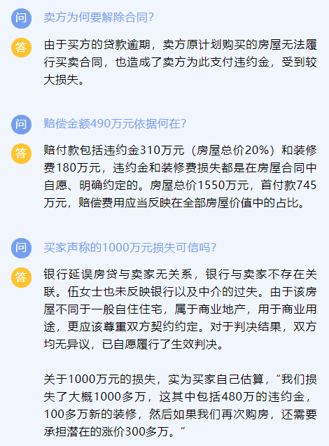 最近一周,一則上海最慘購(gòu)房人稱(chēng)自己損失超千萬(wàn)的消息,多次登上新浪微博熱搜榜前列。根據(jù)一些媒體報(bào)道,伍女士看中了上海市黃浦區(qū)一套價(jià)值約1500萬(wàn)的辦公用房,卻因銀行貸款審批延誤,無(wú)法按照合同規(guī)定時(shí)間付尾款,被賣(mài)方告上法庭。法院最終判決伍女士敗訴,她不僅要退還房子,還要支付違約金、房屋整修費(fèi)、訴訟費(fèi)等總計(jì)497.32萬(wàn)元。