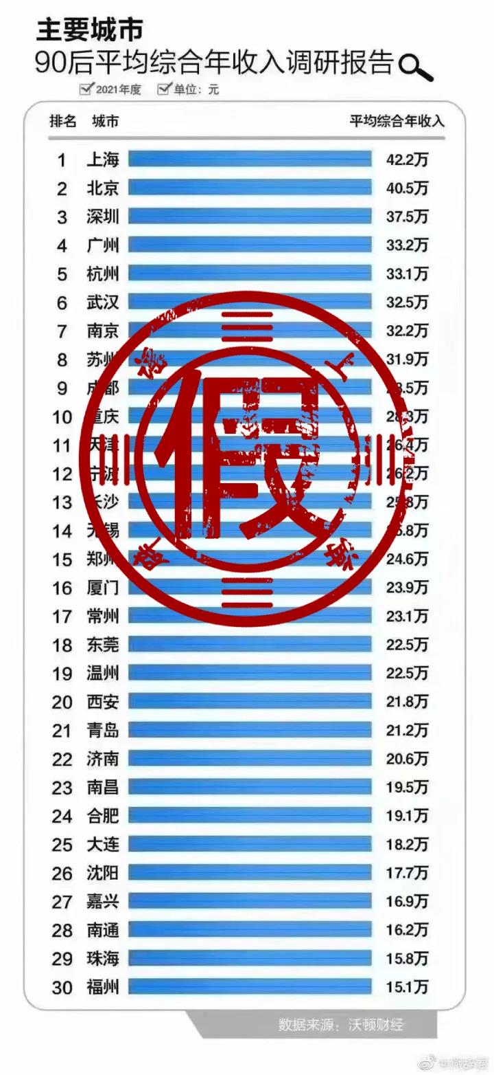 聲稱來自“沃頓財經(jīng)”的《90后平均綜合年收入調(diào)研報告》顯示,2021年度,上海、北京、深圳的90后平均綜合年收入分別為42.2萬元、40.5萬元和37.5萬元,位居全國前三。
