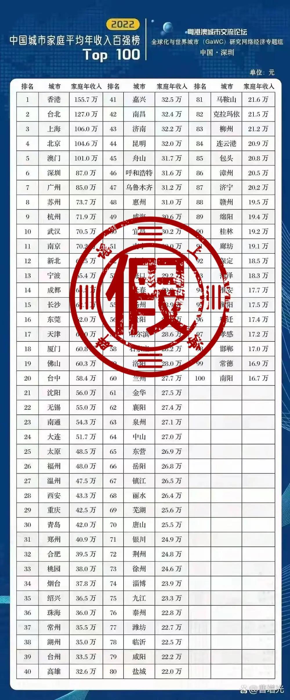 聲稱“粵港澳城市交流論壇”發(fā)布的《2022中國城市家庭平均年收入百強榜》顯示,香港、臺北和上海分別以155.7萬元、127.0萬元和106.0萬元位居中國城市家庭平均年收入前三;