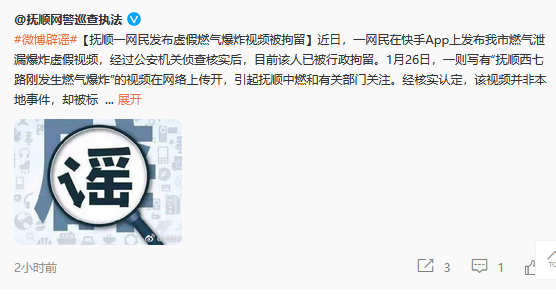 近日,一網(wǎng)民在快手App上發(fā)布撫順市燃?xì)庑孤┍ㄌ摷僖曨l,經(jīng)過公安機關(guān)偵查核實后,目前該人已被行政拘留。