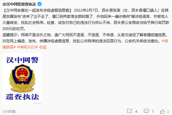 2022年2月7日,西鄉(xiāng)縣張某(女,西鄉(xiāng)縣堰口鎮(zhèn)人)在其朋友圈發(fā)布“進(jìn)來(lái)了出不去了、堰口到肖家灣全部封路了、外地回來(lái)一確診病例”等涉疫謠言,并被他人大量轉(zhuǎn)發(fā),擾亂社會(huì)秩序。經(jīng)查,該張對(duì)自己的違法行為供認(rèn)不諱,西鄉(xiāng)縣公安局依法給予其行政罰款200元的處罰。