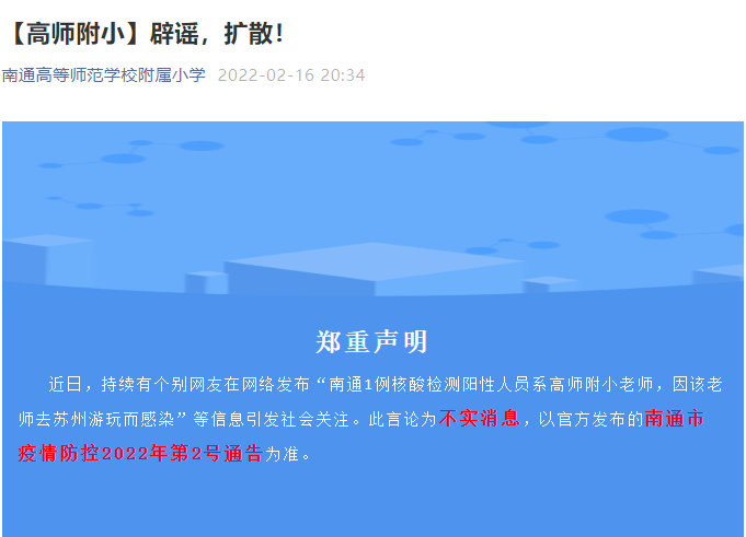 近日,持續(xù)有個(gè)別網(wǎng)友在網(wǎng)絡(luò)發(fā)布“南通1例核酸檢測(cè)陽(yáng)性人員系高師附小老師,因該老師去蘇州游玩而感染”等信息引發(fā)社會(huì)關(guān)注。此言論為不實(shí)消息,以官方發(fā)布的南通市疫情防控2022年第2號(hào)通告為準(zhǔn)。