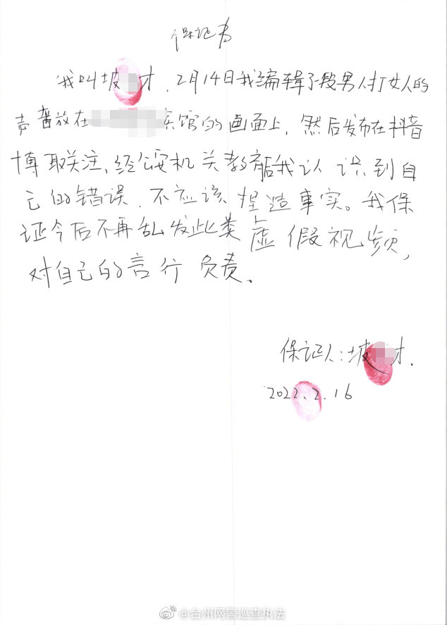 經(jīng)轄區(qū)公安核實,近期該地點并未發(fā)生過類似案件,疑是剪輯而成的虛假視頻。當(dāng)日晚上,視頻制作、發(fā)布人坡某才(男,31歲,云南人在臨海打工)被杜橋派出所傳喚到案。坡某如實陳述了自己的違法事實。他在情人節(jié)剛過的2月15日,在住處附近拍攝了一家小賓館的視頻后,配上網(wǎng)上下載的女子慘叫聲,以《情人節(jié)的下場》為標(biāo)題,發(fā)布了這條虛假視頻。經(jīng)民警批評教育,坡某深刻認(rèn)識到自己的錯誤,并寫下保證書,承諾以后不造謠不傳謠。