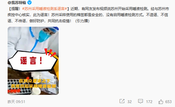 近期,有網(wǎng)友發(fā)布視頻說(shuō)蘇州開(kāi)始采用唾液檢測(cè)。經(jīng)與蘇州市疾控中心核實(shí),此為謠言!蘇州采樣使用的棉簽都是安全的,沒(méi)有啟用唾液檢測(cè)方式。不造謠、不信謠、不傳謠,做好防護(hù),共同抗擊疫情!