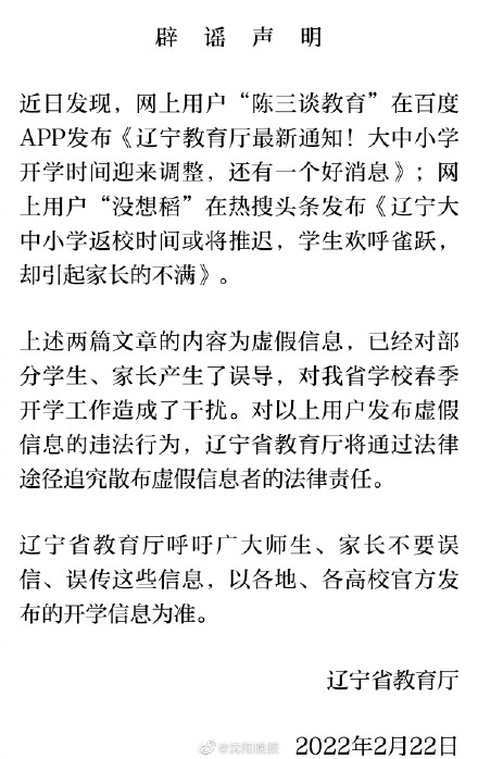 2月22日,遼寧省教育廳通過官微辟謠:近日發(fā)現(xiàn),網(wǎng)上用戶“陳三談教育”在百度APP發(fā)布《遼寧教育廳最新通知!大中小學(xué)開學(xué)時(shí)間迎來調(diào)整,還有一個(gè)好消息》;網(wǎng)上用戶“沒想稻”在熱搜頭條發(fā)布《遼寧大中小學(xué)返校時(shí)間或?qū)⑼七t,學(xué)生歡呼雀躍,卻引起家長的不滿》。據(jù)了解,上述兩篇文章的內(nèi)容為虛假信息,已經(jīng)對部分學(xué)生、家長產(chǎn)生了誤導(dǎo),對我省學(xué)校春季開學(xué)工作造成了干擾。對以上用戶發(fā)布虛假信息的違法行為,遼寧省教育廳將通過法律途徑追究散布虛假信息者的法律責(zé)任。