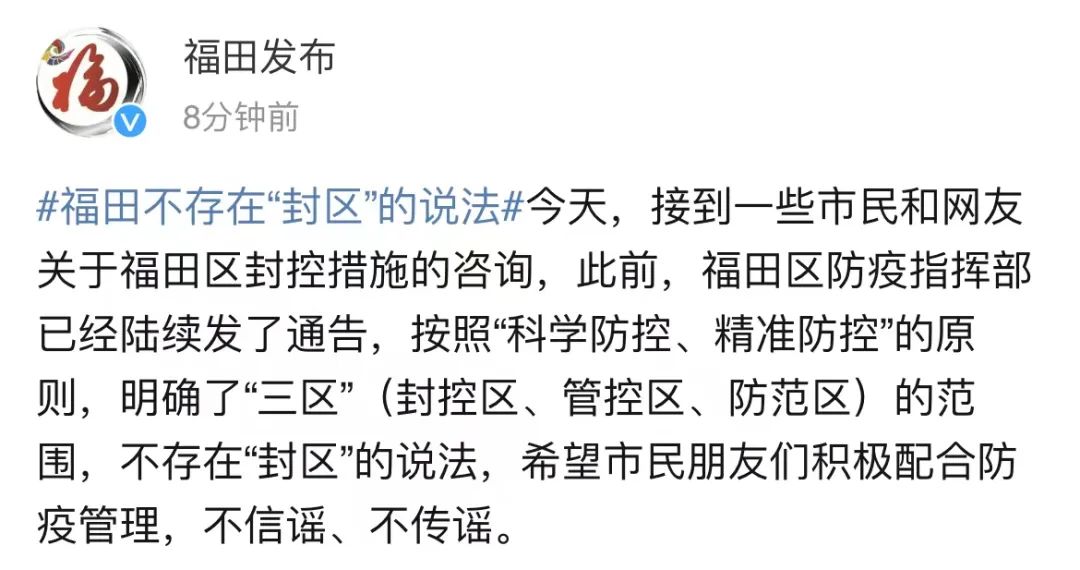 據(jù)福田發(fā)布消息,福田區(qū)不存在“封區(qū)”的說法。近日,接到一些市民和網(wǎng)友關(guān)于福田區(qū)封控措施的咨詢,此前,福田區(qū)防疫指揮部已經(jīng)陸續(xù)發(fā)了通告,按照“科學(xué)防控、精準(zhǔn)防控”的原則,明確了“三區(qū)”(封控區(qū)、管控區(qū)、防范區(qū))的范圍,不存在“封區(qū)”的說法,希望市民朋友們積極配合防疫管理,不信謠、不傳謠。