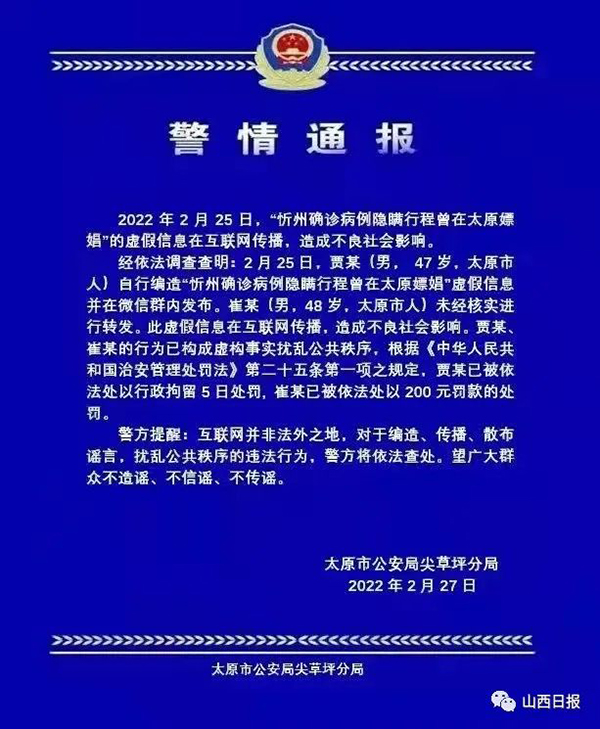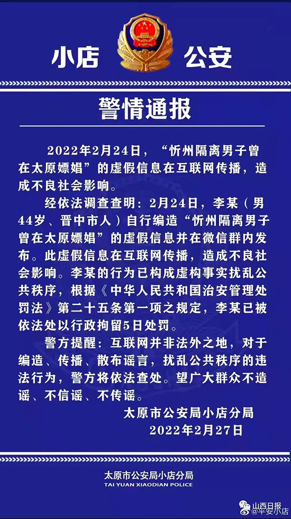 2月27日,太原市公安局小店分局、尖草坪分局,發(fā)布警情通報稱,三名男子因編造、傳播“忻州隔離男子曾在太原嫖娼”的虛假信息在互聯(lián)網傳播,造成不良社會影響,分別拘留、罰款處罰。