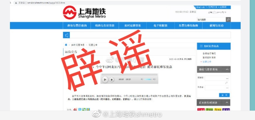 今日網(wǎng)傳暫停運營的11號線昆山段恢復運營,后經(jīng)核實,該網(wǎng)頁截圖系偽造上海地鐵官方網(wǎng)站信息,請大家勿信謠傳謠。