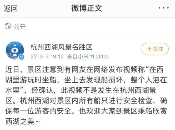 近日,景區(qū)注意到有網(wǎng)友在網(wǎng)絡(luò)發(fā)布視頻稱“在西湖里游玩時(shí)坐船,坐上去發(fā)現(xiàn)船損壞,整個(gè)人泡在水里”,經(jīng)確認(rèn),此視頻不是發(fā)生在杭州西湖景區(qū)。杭州西湖對(duì)景區(qū)內(nèi)所有船只進(jìn)行安全檢查,確保每一位游客的安全。