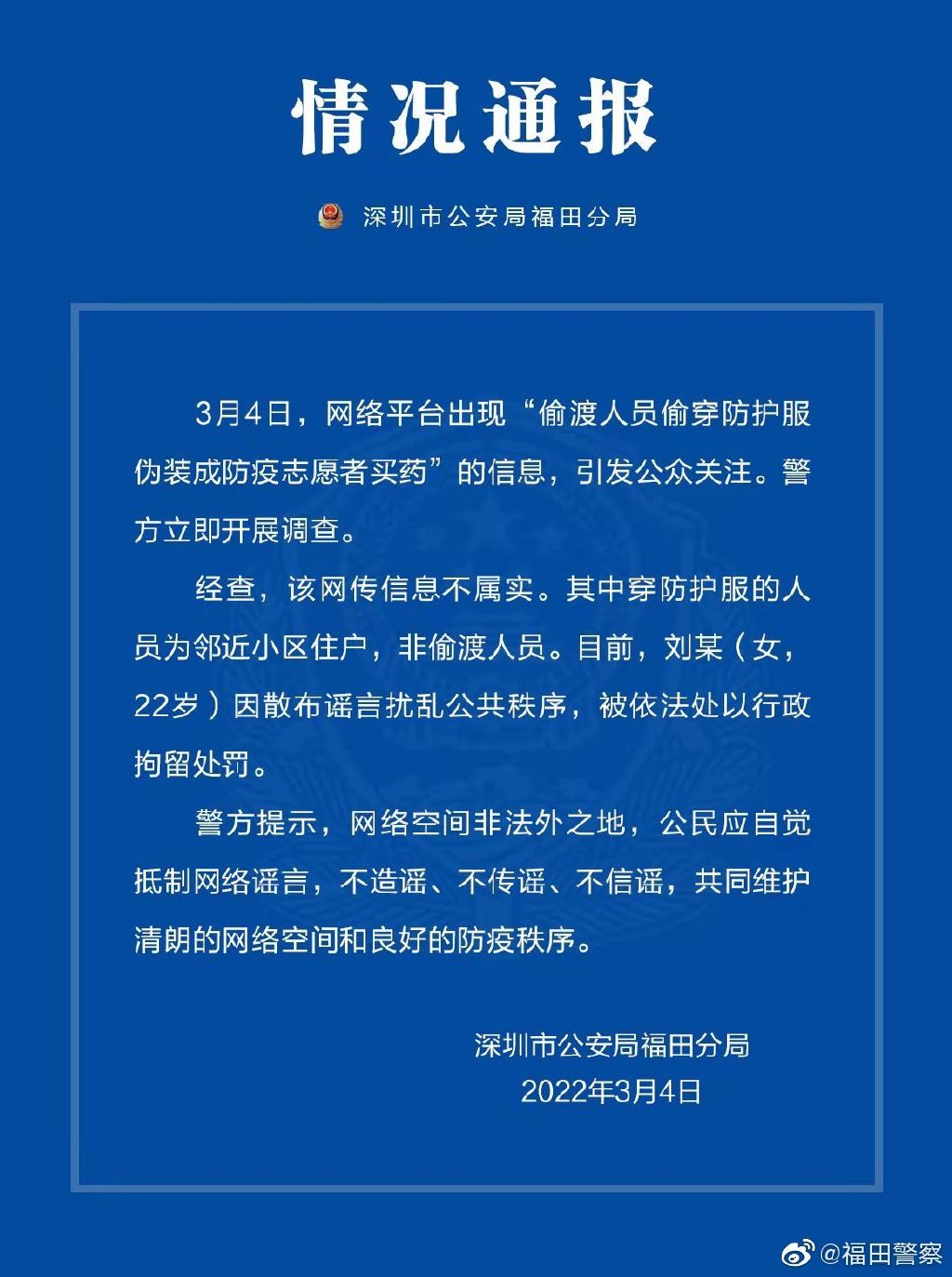 3月4日晚,深圳市公安局福田分局通報(bào),網(wǎng)絡(luò)平臺(tái)出現(xiàn)“偷渡人員偷穿防護(hù)服偽裝成防疫志愿者買藥”的信息,引發(fā)公眾關(guān)注。警方立即開展調(diào)查。經(jīng)查,該網(wǎng)傳信息不屬實(shí)。其中穿防護(hù)服的人員為鄰近小區(qū)住戶,非偷渡人員。目前,劉某(女,22歲)因散布謠言擾亂公共秩序,被依法處以行政拘留處罰。