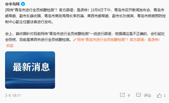 會(huì)上,薛慶國(guó)針對(duì)目前網(wǎng)傳“青島市進(jìn)行全員核酸檢測(cè)”一說(shuō)進(jìn)行辟謠,他強(qiáng)調(diào)這是不正確的,會(huì)引起社會(huì)恐慌,目前是萊西市進(jìn)行全員核酸檢測(cè)。
