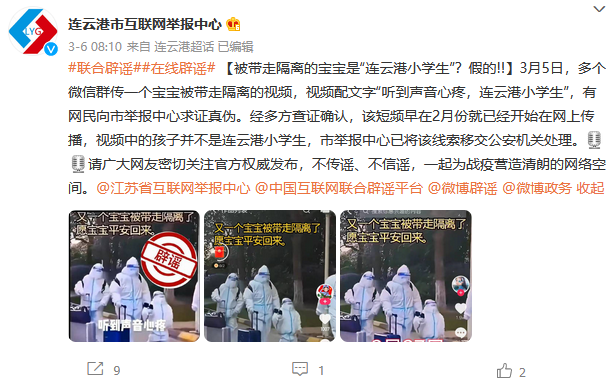 3月5日,多個微信群傳一個寶寶被帶走隔離的視頻,視頻配文字“聽到聲音心疼,連云港小學(xué)生”,有網(wǎng)民向市舉報中心求證真?zhèn)巍?/p>