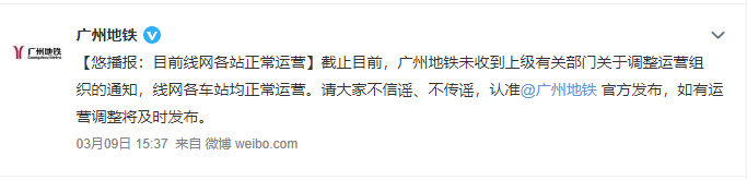 近日,一條關于“廣州地鐵部分站點暫停對外服務”的消息在網(wǎng)上熱傳。3月9日下午,@廣州地鐵 發(fā)布聲明稱截止目前, 未收到上級有關部門關于調(diào)整運營組織的通知,線網(wǎng)各車站均正常運營。請大家不信謠、不傳謠。 ???