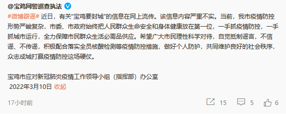 近日,有關“寶雞要封城”的信息在網(wǎng)上流傳。該信息內容嚴重不實。當前,我市疫情防控形勢嚴峻復雜,市委、市政府始終把人民群眾生命安全和身體健康放在第一位,一手抓疫情防控,一手抓城市運行,全力保障市民群眾生活必需品供應。希望廣大市民理性科學對待,自覺抵制謠言,不信謠、不傳謠,積極配合落實全員核酸檢測等疫情防控措施,做好個人防護,共同維護良好的社會秩序,眾志成城打贏疫情防控這場硬仗。