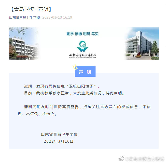 近期,有網(wǎng)傳青島衛(wèi)校不實(shí)涉疫信息。3月10日,青島衛(wèi)生學(xué)校發(fā)布聲明,目前,學(xué)校教學(xué)秩序正常,未發(fā)生此類情況。