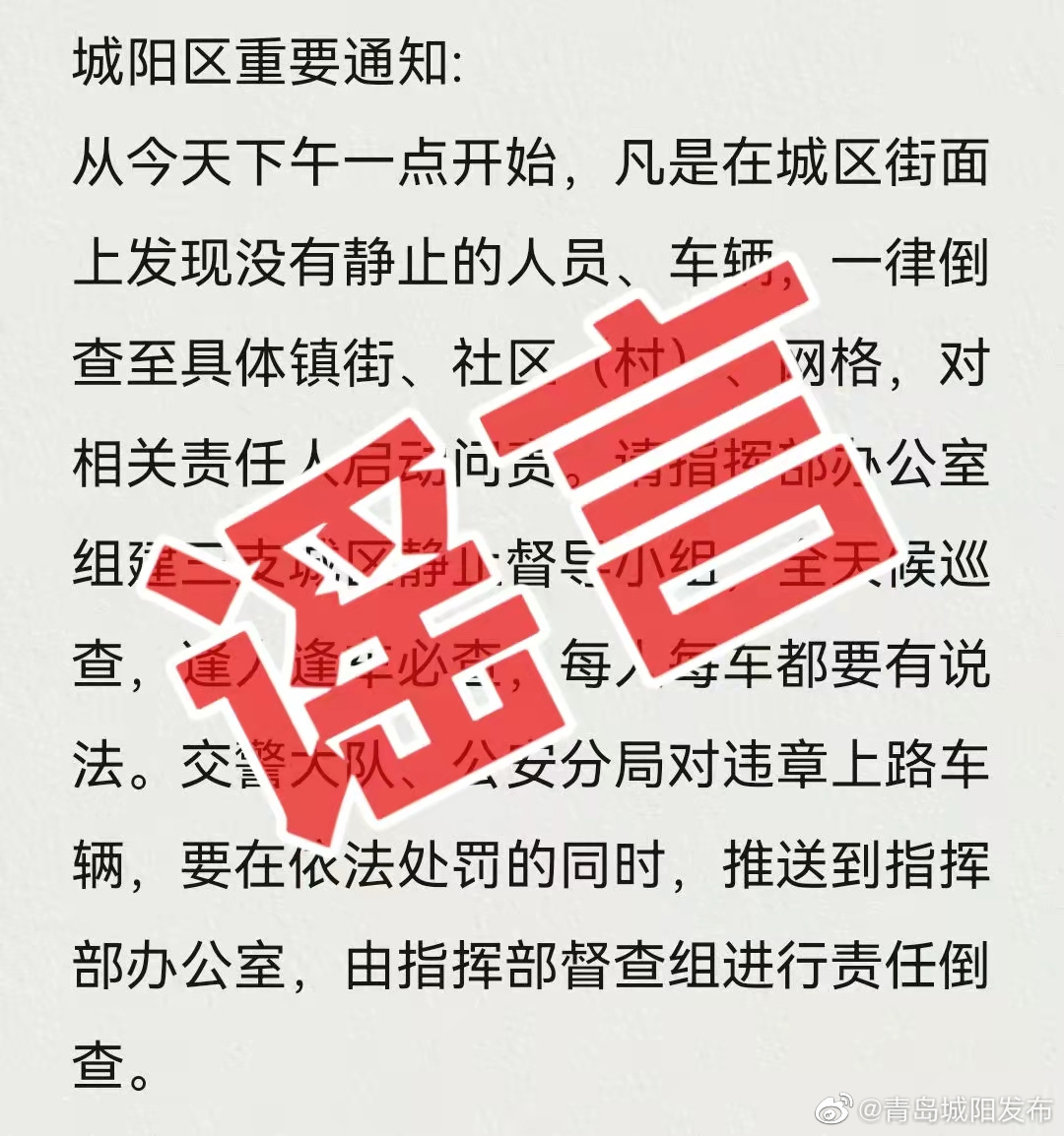 3月14日,部分網(wǎng)友微信朋友圈和微信群中流傳“從今天下午一點(diǎn)開始,凡是在青島市城陽區(qū)街面上發(fā)現(xiàn)沒有靜止的人員、車輛,一律倒查至具體鎮(zhèn)街、社區(qū)(村)、網(wǎng)格,對(duì)相關(guān)責(zé)任人啟動(dòng)問責(zé)”等內(nèi)容的消息,經(jīng)核實(shí)該信息不屬實(shí)。