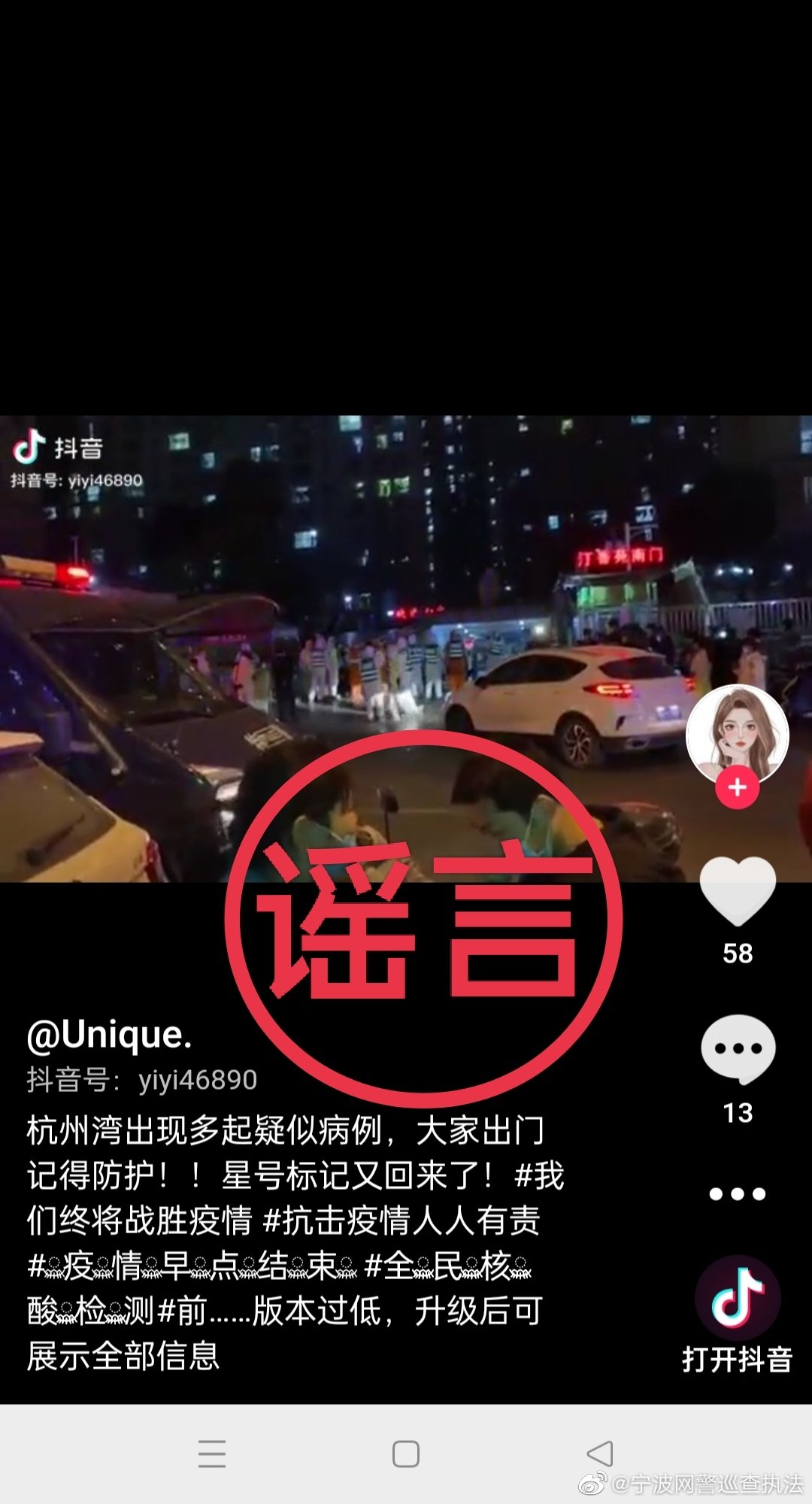 今天,抖音號(hào)上出現(xiàn)了關(guān)于杭州灣出現(xiàn)多起疑似病例的消息,經(jīng)官方確認(rèn)此為假消息。