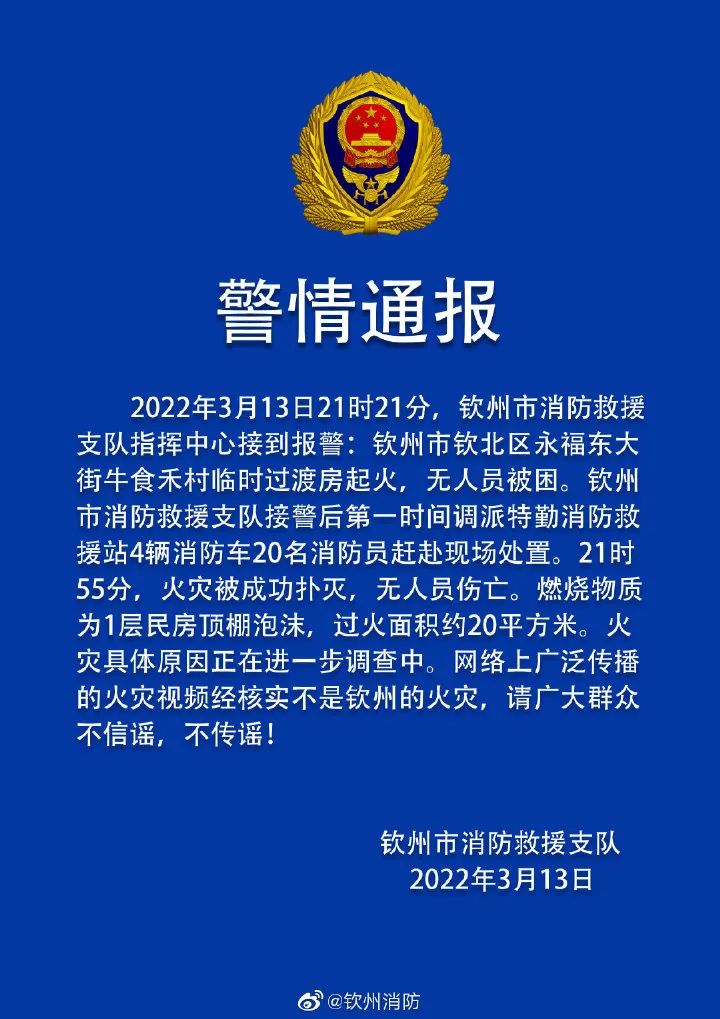 3月13日 21時許,欽州市欽北區(qū)永福東大街牛食禾村一臨時過渡房發(fā)生火災(zāi),21時55分火災(zāi)已成功撲滅,未造成人員傷亡,過火面積約為20平方米。目前火災(zāi)具體原因正在進一步調(diào)查中。網(wǎng)絡(luò)上廣泛傳播的火災(zāi)視頻經(jīng)核實不是欽州的火災(zāi),請廣大群眾不信謠,不傳謠!