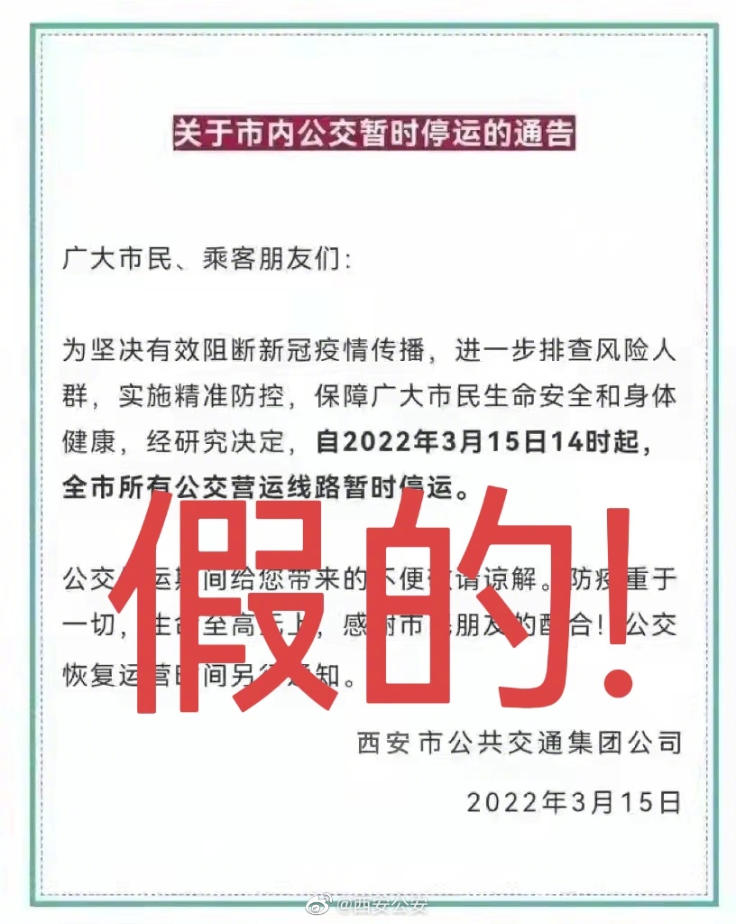 網(wǎng)傳“西安公交停運(yùn)”及“西安所有小區(qū)封閉”信息不屬實(shí),為謠言!請大家關(guān)注官方發(fā)布渠道,切勿聽信小道消息,做到不造謠不信謠不傳謠。