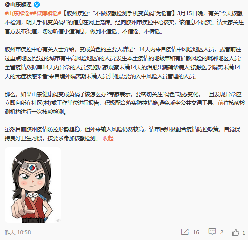 3月15日晚,有關(guān)“今天核酸不檢測,明天手機(jī)變黃碼!”的信息在網(wǎng)上流傳。經(jīng)向膠州市疾控中心核實,該信息不屬實。請大家關(guān)注官方發(fā)布渠道,切勿聽信小道消息,做到不造謠、不信謠、不傳謠。