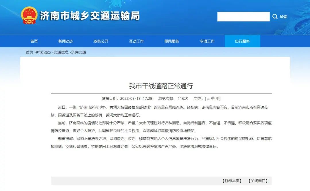 近日,一則“濟南市所有浮橋,黃河大橋因疫情全部封閉”的消息在網(wǎng)絡(luò)流傳。經(jīng)核實,該信息內(nèi)容不實,目前濟南市所有高速公路、國省道及國省干線上的浮橋、黃河大橋均正常通行。