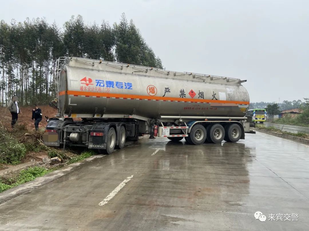 同一時間,一輛危險品運(yùn)輸半掛車也行駛到同一路段時,也發(fā)生側(cè)滑甩尾碰到路邊停著的一輛二輪電動車,危險品運(yùn)輸半掛車車頭沖出路面停在路邊空地里,車尾橫在道路中間,將路面堵住,此次事故無人傷亡。