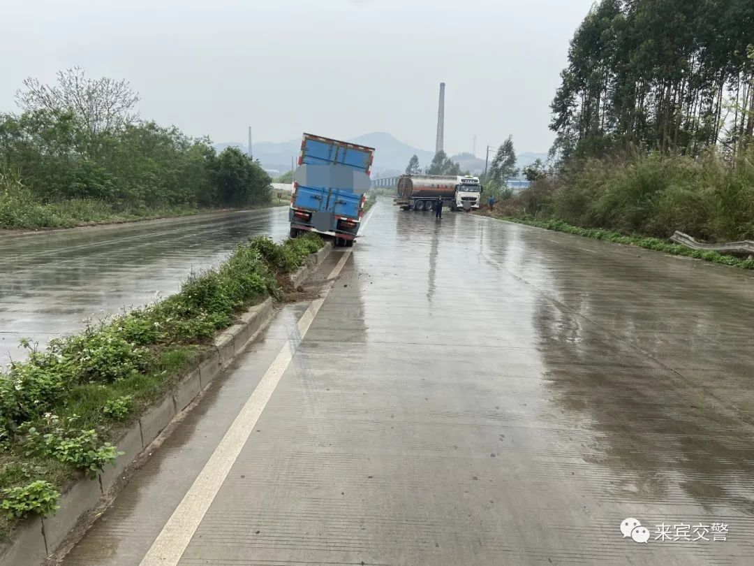 一輛藍(lán)色的廂式貨車在途經(jīng)上述路段時,輪胎打滑,失控騎上了中間隔離綠化帶,此次事故無人傷亡。