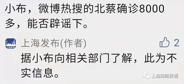 3月22日上午,有網(wǎng)友在上海發(fā)布評論區(qū)詢問:北蔡確診8000多,能否辟謠下?對此,上海發(fā)布回復:據(jù)小布向相關部門了解,此為不實消息。