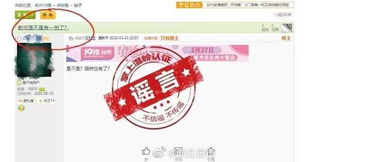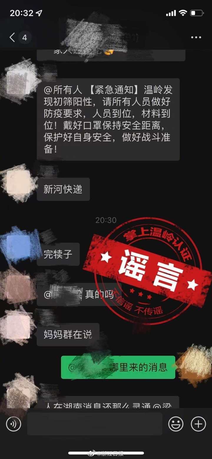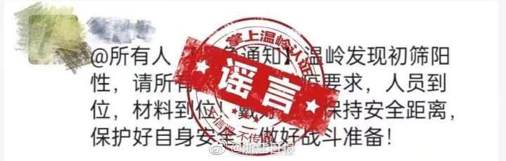 3月23日,網(wǎng)傳溫嶺市出現(xiàn)初篩陽性病例。經(jīng)核實,此消息不實,系謠言!截至3月24日中午11時,溫嶺市未發(fā)現(xiàn)本土確診病例和無癥狀感染者。請廣大居民關(guān)注官方權(quán)威發(fā)布,不信謠、不傳謠、不造謠,進一步提高防范意識,關(guān)注自身健康狀況,做好個人防護。 ???