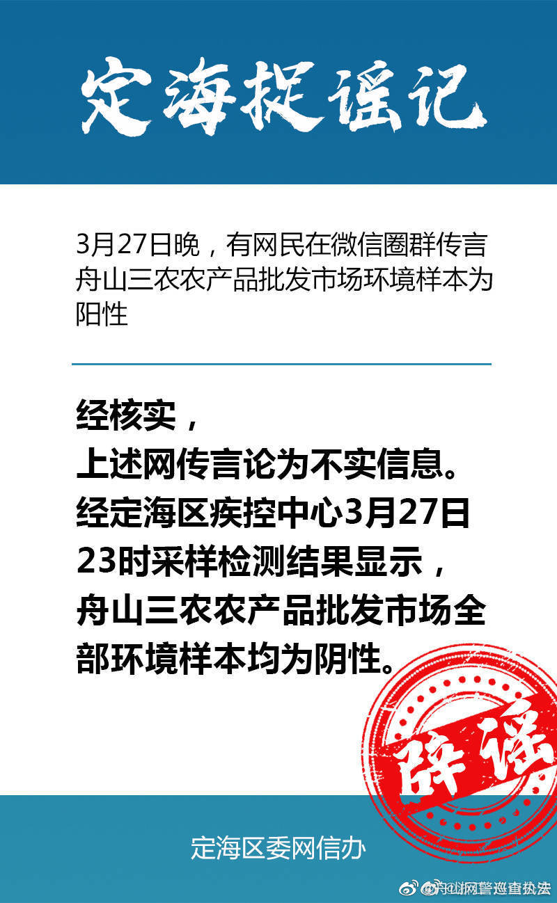 3月27日晚,有網(wǎng)民在微信圈群傳言舟山三農(nóng)農(nóng)產(chǎn)品批發(fā)市場(chǎng)環(huán)境樣本為陽(yáng)性。經(jīng)核實(shí),上述網(wǎng)傳言論為不實(shí)信息。經(jīng)定海區(qū)疾控中心3月27日23時(shí)采樣檢測(cè)結(jié)果顯示,舟山三農(nóng)農(nóng)產(chǎn)品批發(fā)市場(chǎng)全部環(huán)境樣本均為陰性。
