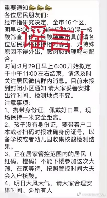 近日,網(wǎng)傳“3月29日全市16個(gè)區(qū)啟動(dòng)核酸篩查工作”的截圖引起部分市民的關(guān)注。經(jīng)與市疫情防控指揮部核實(shí),該通知消息為不實(shí)信息,請(qǐng)廣大市民及時(shí)關(guān)注官方權(quán)威消息,不傳播未經(jīng)證實(shí)信息,共同維護(hù)清朗網(wǎng)絡(luò)環(huán)境。