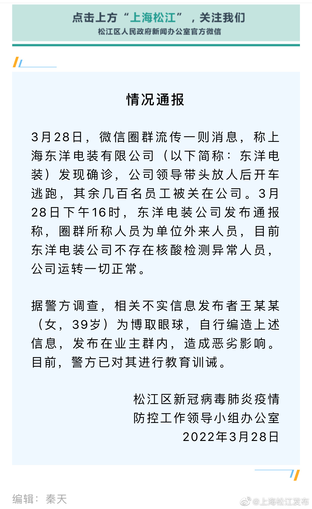 3月28日,微信圈群流傳一則消息,稱上海東洋電裝有限公司(以下簡(jiǎn)稱:東洋電裝)發(fā)現(xiàn)確診,公司領(lǐng)導(dǎo)帶頭放人后開車逃跑,其余幾百名員工被關(guān)在公司。3月28日下午16時(shí),東洋電裝公司發(fā)布通報(bào)稱,圈群所稱人員為單位外來(lái)人員,目前東洋電裝公司不存在核酸檢測(cè)異常人員,公司運(yùn)轉(zhuǎn)一切正常。