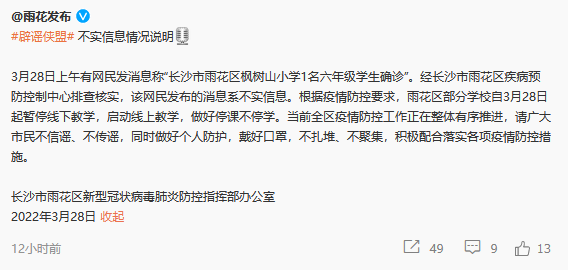 3月28日上午有網(wǎng)民發(fā)消息稱“長沙市雨花區(qū)楓樹山小學(xué)1名六年級學(xué)生確診”。經(jīng)長沙市雨花區(qū)疾病預(yù)防控制中心排查核實(shí),該網(wǎng)民發(fā)布的消息系不實(shí)信息。
