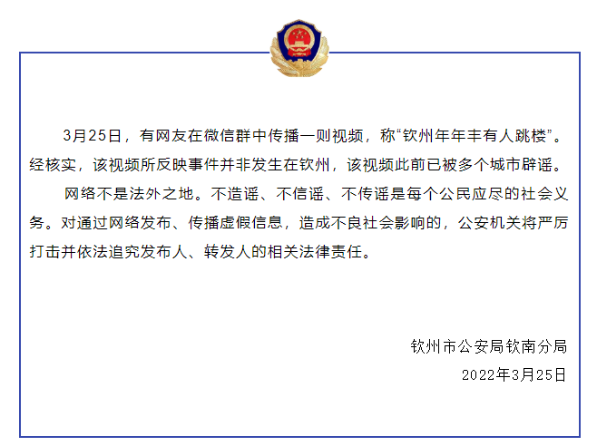 3月25日,有網(wǎng)友在微信群中傳播一則視頻,稱“欽州年年豐有人跳樓”。該視頻被轉(zhuǎn)發(fā)多個群后,引起市民的廣泛關(guān)注,造成了惡劣社會影響。經(jīng)核實(shí),該視頻所反映事件并非發(fā)生在欽州,欽南警方已于3月25日下午緊急辟謠。