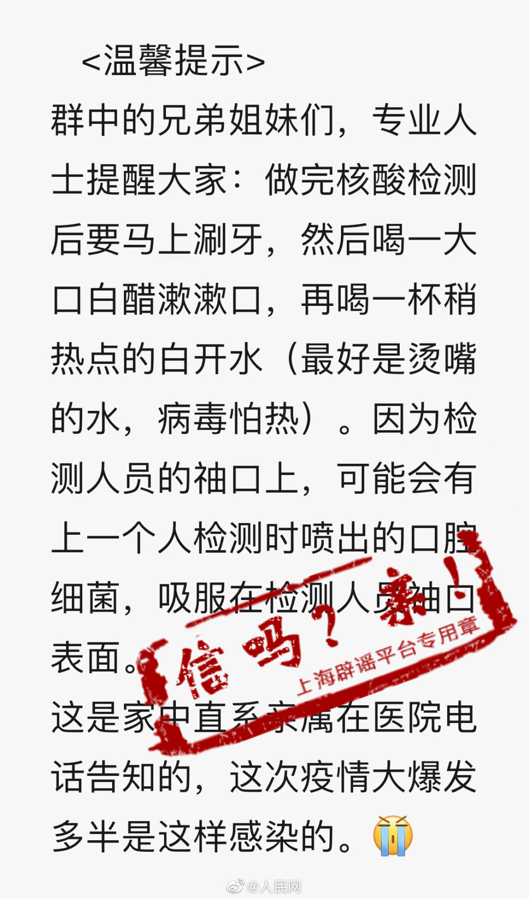 近日,一條“溫馨提醒”聲稱,做完核酸要喝醋和熱水殺菌。對此專家辟謠:喝醋并不會殺死新冠病毒,反而會刺激人的胃腸道,另一種喝熱水殺新冠病毒的說法,也是移花接木的謠言。參加核酸采樣的醫(yī)護人員,在完成一次采樣后都會立即噴灑酒精,嚴格做好手消毒,所以不會出現(xiàn)傳染的可能。其次,醫(yī)護人員使用的咽拭子是一種長棉簽,操作者在采樣時能有效避免觸碰到被采人員面部,所以同樣不會出現(xiàn)傳染的情況。