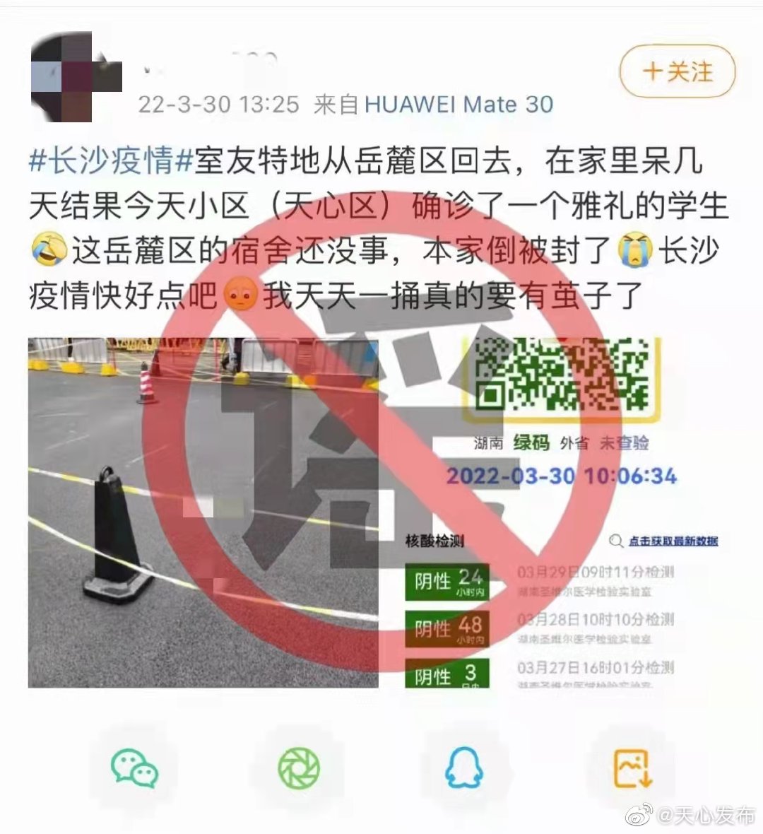 3月30日,網(wǎng)傳“長(zhǎng)沙市天心區(qū)確診了一個(gè)雅禮的學(xué)生”“五一廣場(chǎng)三興街出現(xiàn)一例陽(yáng)性病例”的信息,經(jīng)向天心區(qū)疫情防控指揮部核實(shí),以上信息均為不實(shí)信息。
