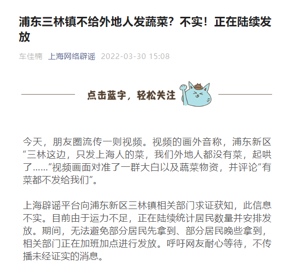 據(jù)“上海網(wǎng)絡(luò)辟謠”公眾號(hào)消息,今日朋友圈流傳一段視頻稱,浦東新區(qū)三林鎮(zhèn)只發(fā)上海人的菜,外地人沒(méi)有菜。視頻畫面對(duì)準(zhǔn)了一群大白以及蔬菜物資,并評(píng)論“有菜都不發(fā)給我們”。