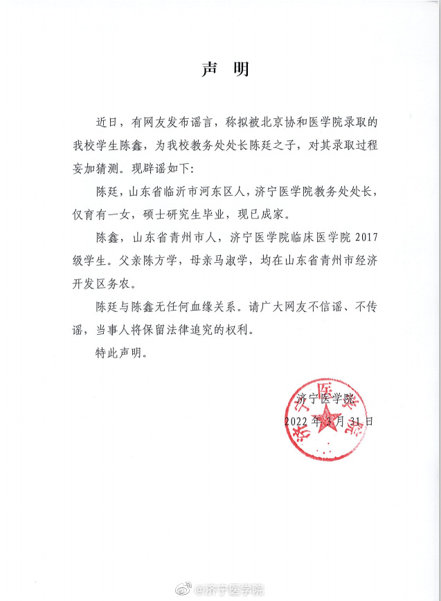 近日,有網(wǎng)友發(fā)布謠言,稱擬被北京協(xié)和醫(yī)學(xué)院錄取的我校學(xué)生陳鑫,為我校教務(wù)處處長陳廷之子,對其錄取過程妄加猜測?,F(xiàn)辟謠如下: ???