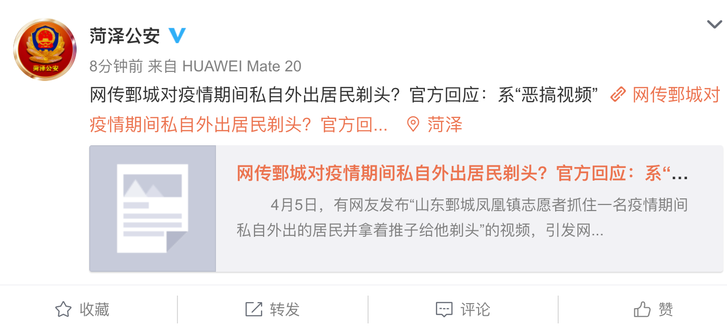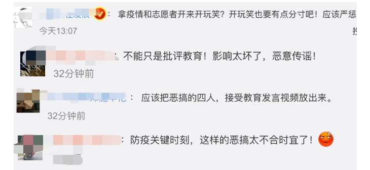 鄄城縣公安局鳳凰鎮(zhèn)派出所所長劉傳舉表示,經調查,平時侯某省、侯某國、侯某博、王某4人經常在一起玩,關系比較密切,其中侯某省平時也經常拍攝短視頻發(fā)布到抖音平臺,于是4名青年共同商討拍攝了該視頻。但是,這樣的“惡搞視頻”擾亂了正常的防疫秩序,在網上混淆視聽,目前,警方已對視頻攝制者進行了批評教育。