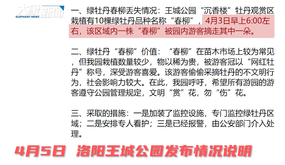 4月4日,網(wǎng)傳洛陽王城公園內(nèi)一株價值10萬元的綠色牡丹花被游客摘走。洛陽王城公園工作人員表示,被游客摘走的綠色牡丹品種為春柳,實際價值并沒有網(wǎng)上傳言那么昂貴,由于春柳牡丹人氣較高,園方已經(jīng)加裝監(jiān)控并派專人看護。