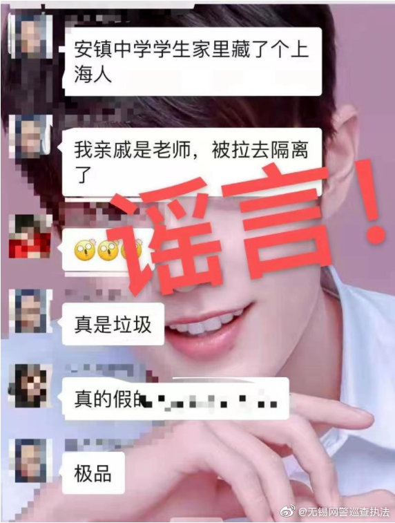 4月7日晚,無錫錫山公安分局安鎮(zhèn)派出所在工作中發(fā)現(xiàn),轄區(qū)居民微信朋友圈流傳一條“安鎮(zhèn)中學(xué)學(xué)生家長窩藏上海人導(dǎo)致全校隔離”的信息。經(jīng)查,該信息為謠言。戴某某為博眼球,于4月7日晚在微信群內(nèi)編造、散布該涉疫謠言,擾亂公共秩序。4月8日戴某某被公安機(jī)關(guān)依法處以行政處罰。
