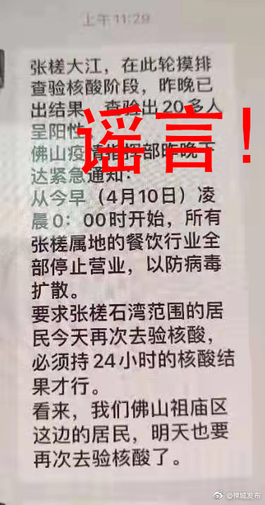 4月11日,“張槎大江村被查驗(yàn)出20多人呈陽性”的消息在微信群和網(wǎng)絡(luò)上被廣泛傳播。佛山市禪城區(qū)張槎街道新冠肺炎疫情防控指揮部辦公室表示,該傳言相關(guān)內(nèi)容不準(zhǔn)確。