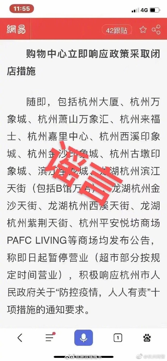 4月12日,不少人發(fā)現(xiàn)微信群里流傳一張截圖,截圖內(nèi)容顯示,購物中心立即響應(yīng)政策采取閉店措施,包括杭州大廈、杭州萬象城、杭州蕭山萬象匯、杭州來福士、杭州嘉里中心、杭州西溪印象城等多家商場均發(fā)布公告,稱即日起暫停營業(yè)。請大家不要信謠傳謠!