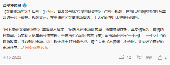 “網(wǎng)上流傳‘東湖市場封閉’等消息不屬實!”記者從市市場監(jiān)管局、市商務(wù)局獲悉,真實情況為,疫情防控期間,為實現(xiàn)人員單向分流管理,寧德市中心城區(qū)各農(nóng)(集)貿(mào)市場正進(jìn)行“一個出口、一個入口”的設(shè)施改造,并非封閉市場,該工程計劃于17日前完成。請廣大市民不信謠、不傳謠,共同維護(hù)良好的市場秩序。
