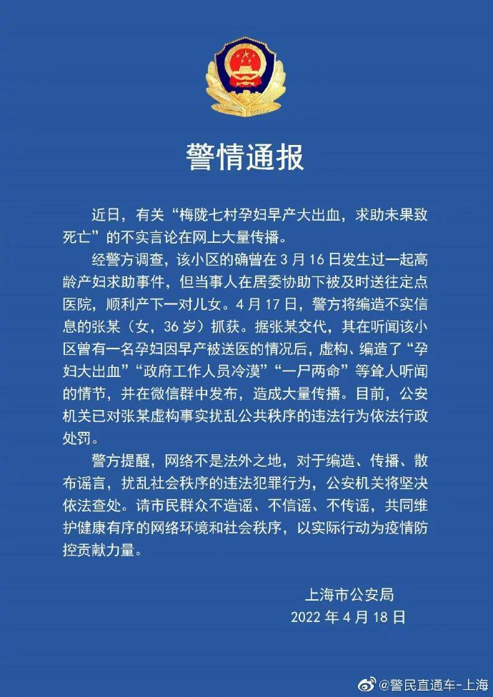 4月17日,警方將編造不實(shí)信息的張某抓獲。據(jù)張某交代,其在聽聞該小區(qū)曾有一名孕婦因早產(chǎn)被送醫(yī)的情況后,虛構(gòu)、編造了“孕婦大出血”“政府工作人員冷漠”“一尸兩命”等聳人聽聞的情節(jié),并在微信群中發(fā)布,造成大量傳播。
