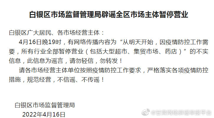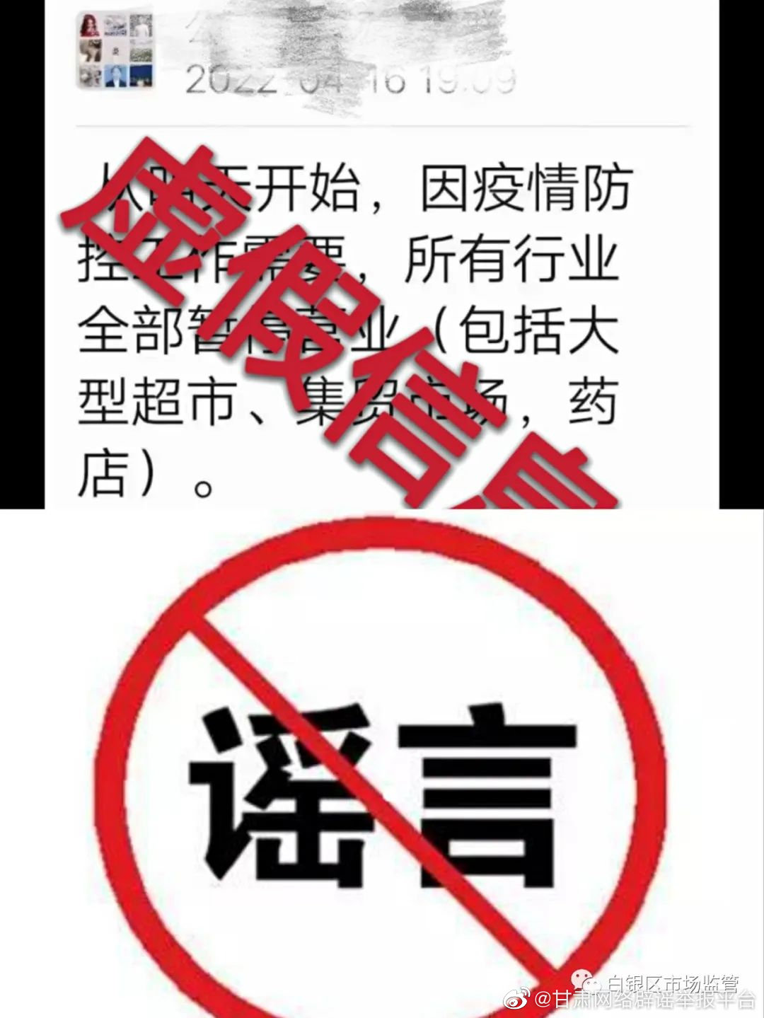 4月16日晚19時,有網絡傳播內容為“從明天開始,因疫情防控工作需要,所有行業(yè)全部暫停營業(yè)(包括大型超市、集貿市場、藥店)”的不實信息,此信息為謠言,請勿輕信,勿轉發(fā)!請各市場經營主體單位按照疫情防控工作要求,嚴格落實各項疫情防控措施,規(guī)范經營,不信謠、不傳謠!